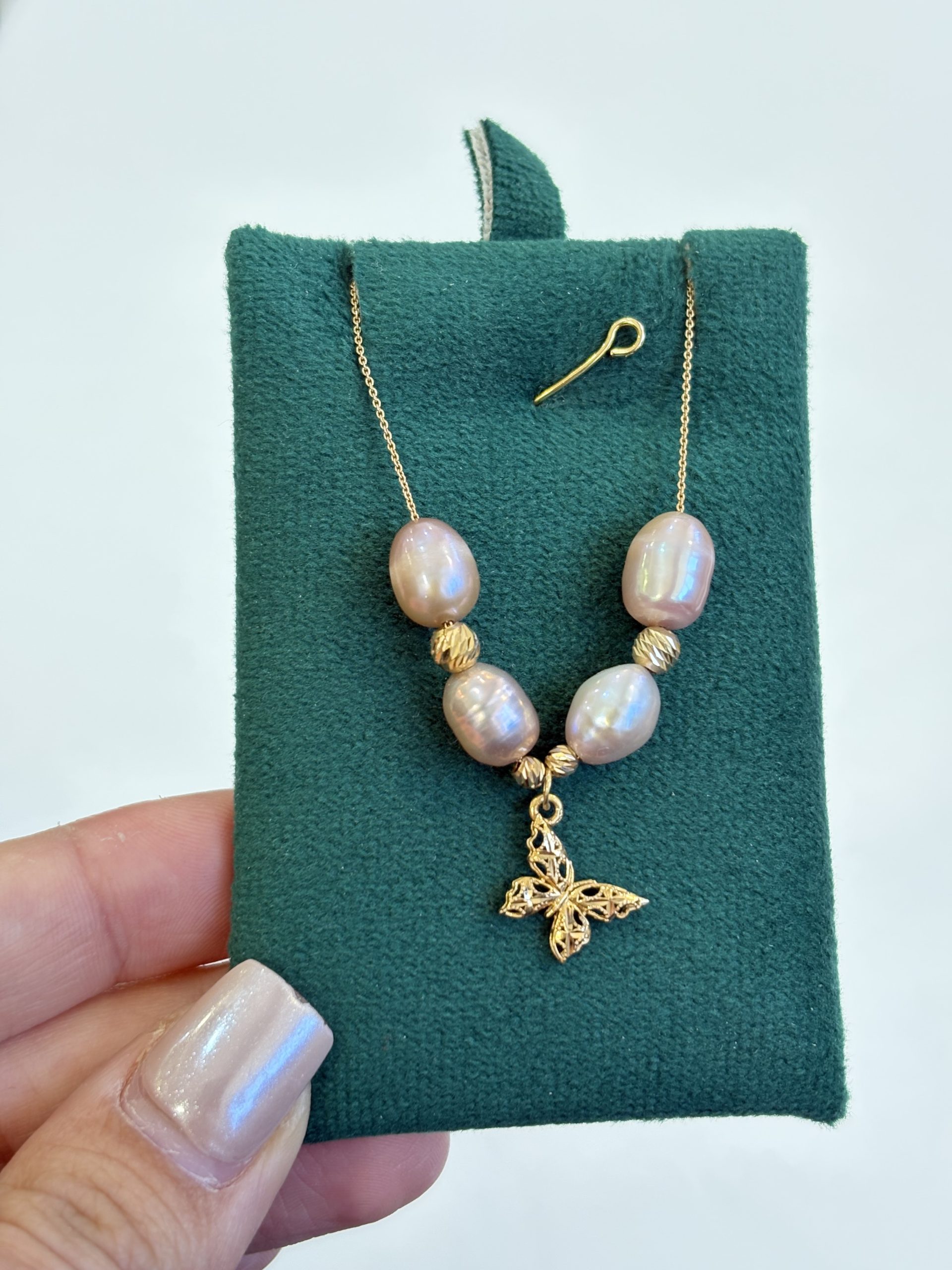 پلاک و زنجیر متصل گوی و پروانه با مروارید پرورشی